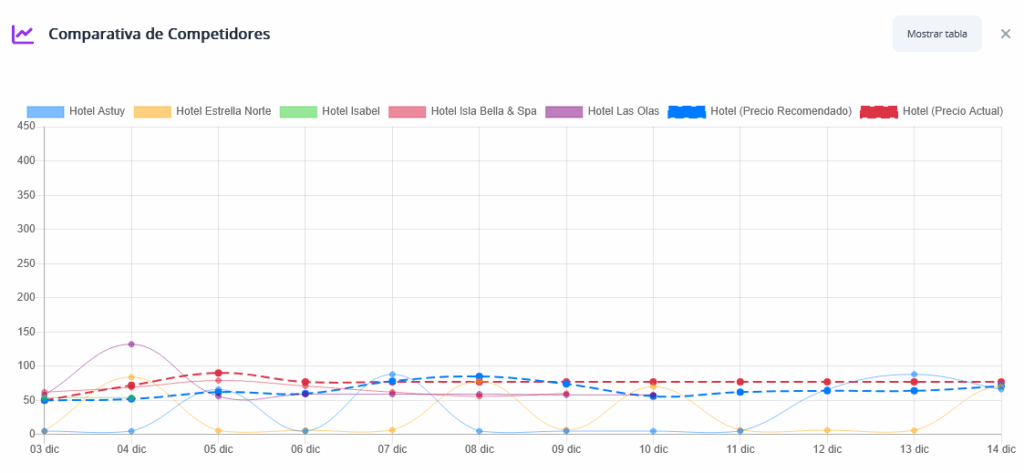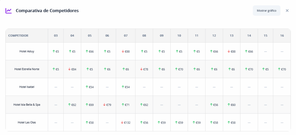 Al pulsar en “Gráficos”, se muestra una comparativa visual de tus precios frente a los competidores.