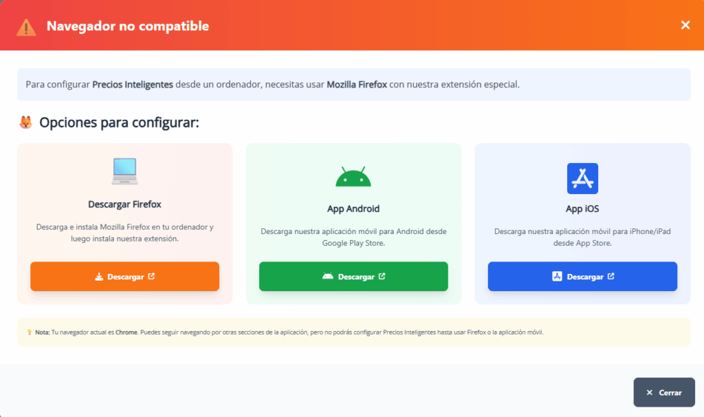 Cómo se ve desde la versión web: solo funcionará en el navegador firefox y si lo abren desde otro navegador saldrá el siguiente pop up: