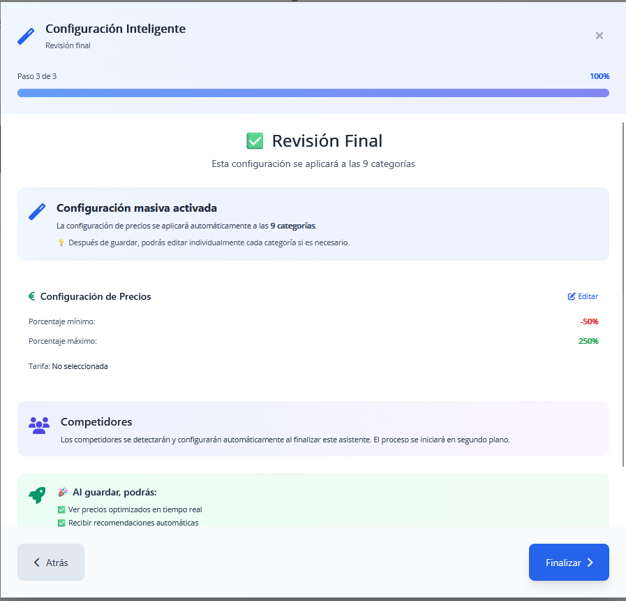 •  El sistema calculará los precios mínimo y máximo tomando como referencia tus precios estándar o históricos.