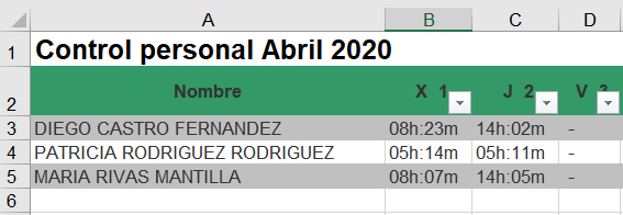 In the upper band you can see the day of the week next to the number of the corresponding month. In the vertical band there are the registered workers. The values will be represented on the right over the total working day.