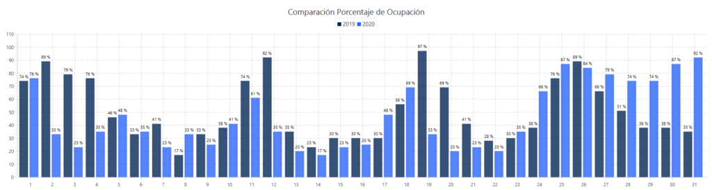 Comparison of the previous year to the current year, represented in bar charts. It shows the daily occupation of the chosen month.